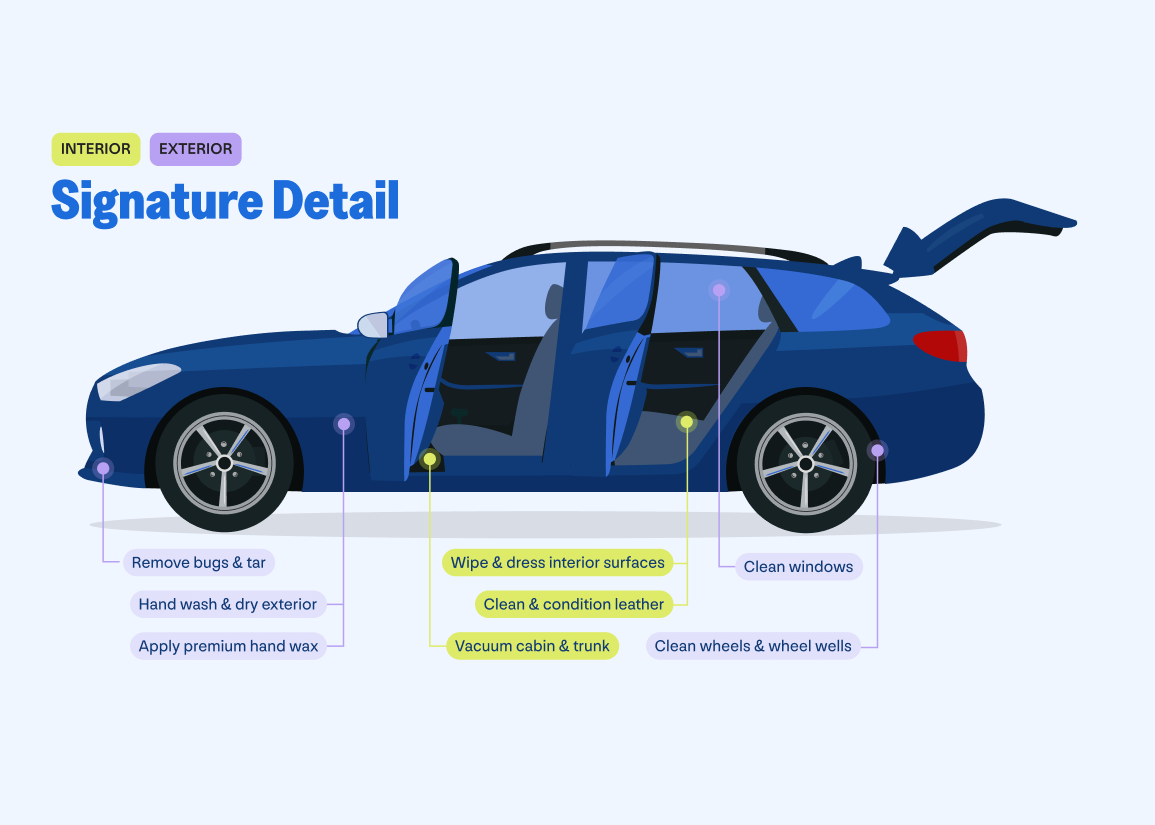 If you’ve never had one before, may we suggest our Signature Detail? We’ll thoroughly clean your car inside and out, complete with wax treatment and wheel cleaning.